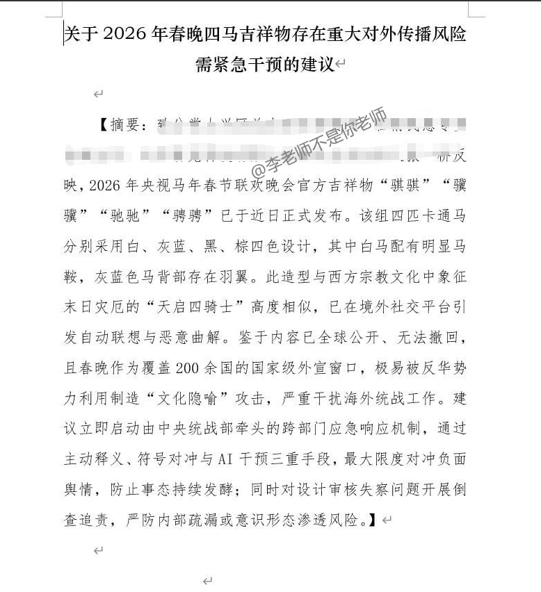 网友投稿内部文件:“关于2026年春晚四马马吉祥物存在重大对外传播风险需紧急干预的建议”。