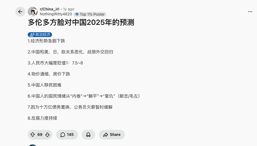 美元对人民币汇率 这个确实是我去年年底做的所有预测中,翻车最严重的一个 我在今年年度总结中,也反思了翻车的原因 我认为2025年人民币会继续贬值以对抗出口压力的趋势是没有错的 但是错在不懂美国,没想到川普搞了一通,导致美元一年贬值那么多,贬的比人民币更快 下次只预测中国,不预测美国了