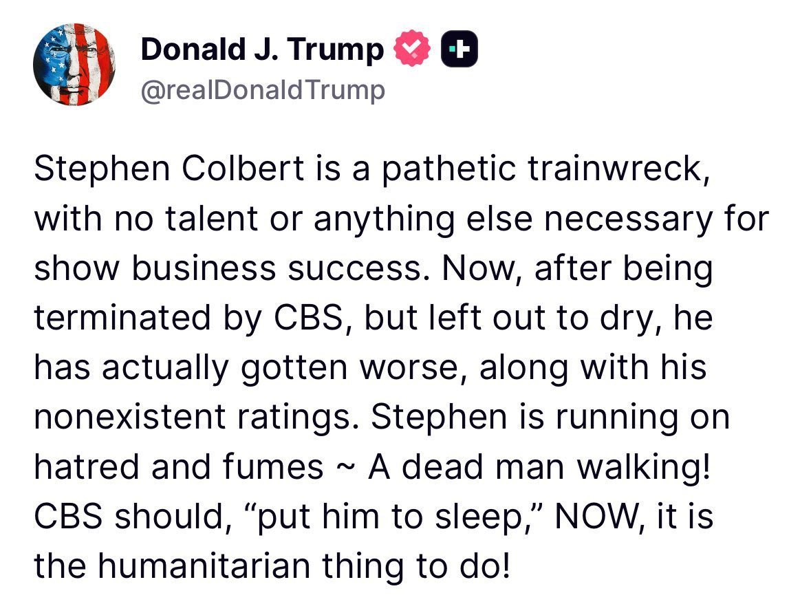 美国有三个著名的脱口秀节目主持人:CBS的Stephen Colbert,NBC的Jimmy Fallon,ABC的Jimmy Kimmel。他们经常调侃各类政治人物和事件,包括特朗普。 圣诞夜,特朗普送给Stephen的祝福是敦促CBS让这位深夜脱口秀主持人“安乐死”(put him to sleep),因为他是“将死之人”(a dead man walking)。 尼玛!