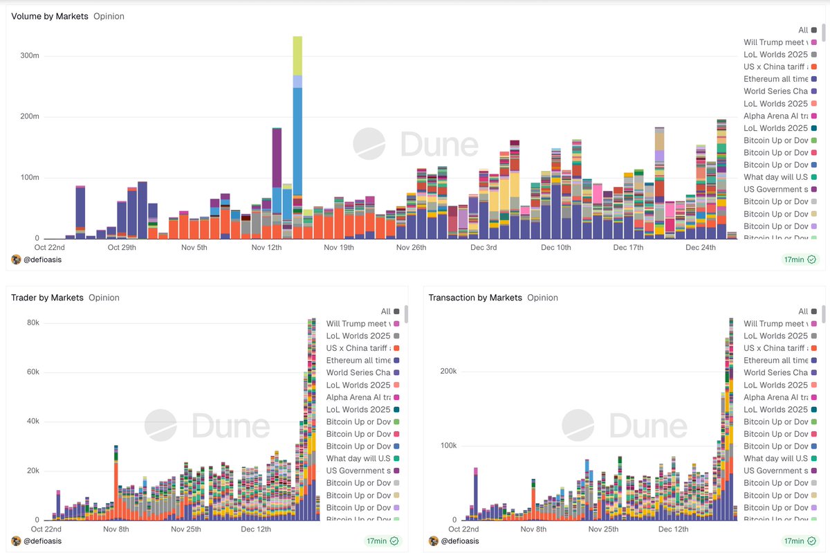 Opinion 昨日交易量 / 交易地址数 / 交易笔数达到 11.15 以来的峰值📈 ▶︎ 交易量:1.96 亿美元 ▶︎ 交易地址数:82324 ▶︎ 交易笔数:27.2 万笔 上一次这么大的量是在押注「Monad 什么时候发空投」😂 顺便贴下交易量 TOP3 押注的问题 1️⃣ US Fed Rate Decision 2️⃣ 日本央行利率决议 3️⃣ Based