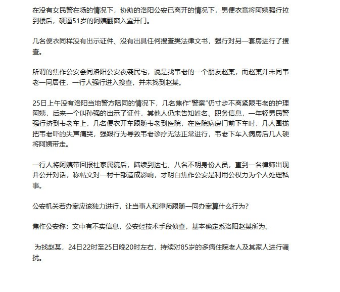 12月24日22时许,洛阳市老城区报社家属院内,一名85岁老人已入睡,突遭自称“焦作警方”人员上门检查。2名着警服、3名便衣进入住宅,但拒绝出示执法证件及法律文书。