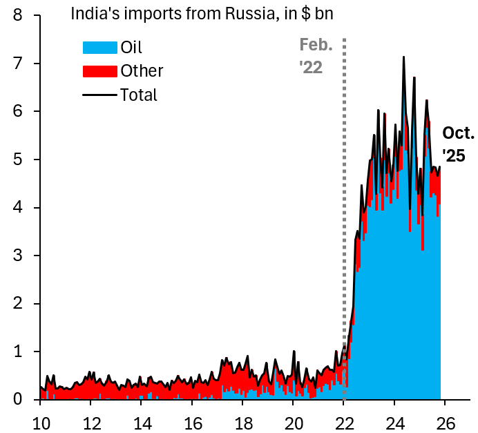 Right after the invasion of Ukraine, India started importing huge amounts of Russian oil. The US put an additional 25% punitive tariff on India in Aug. '25, but that didn't stop this. US sanctions on Rosneft and Lukoil are now finally ending this racket...