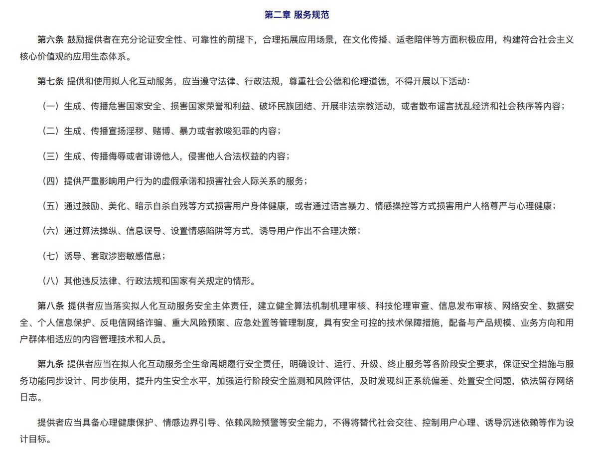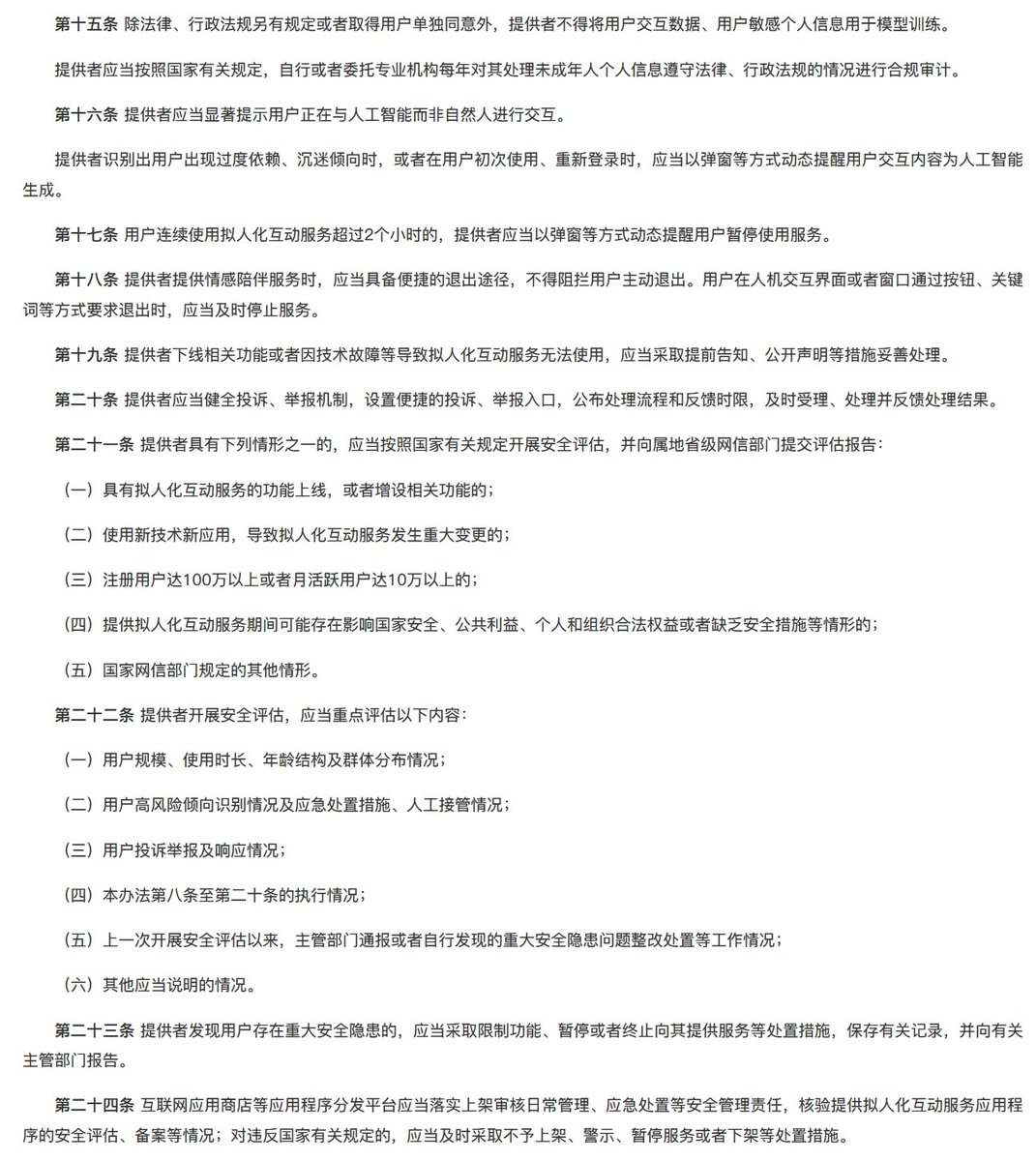 网信办发布《人工智能拟人化互动服务管理暂行办法(征求意见稿)》,要求服务者不得通过算法操纵、信息误导、设置情感陷阱等方式,诱导用户作出不合理决策; 发现用户明确提出实施自杀、自残等极端情境时,由人工接管对话并联络监护人。