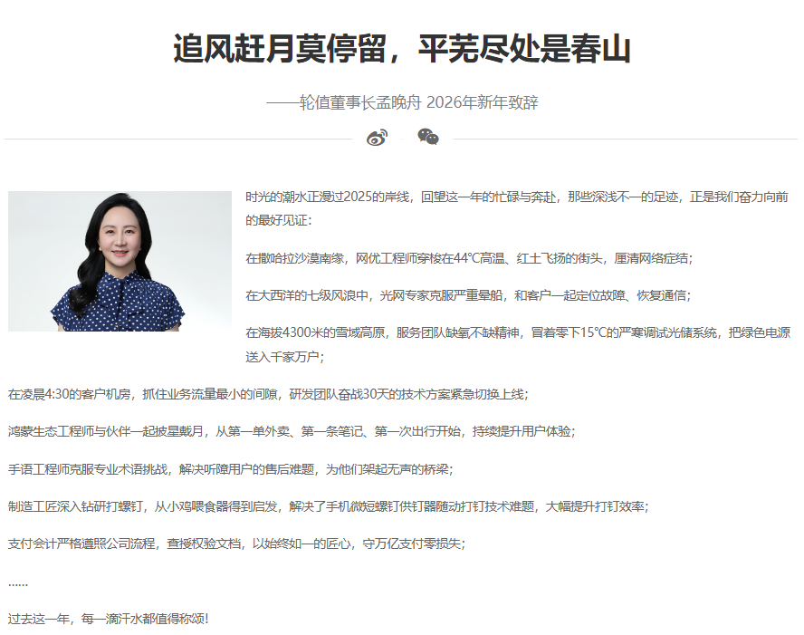 12月30日,中国科技巨头华为公司轮值董事长孟晚舟通过华为官网及公众号发布2026年新年致辞,题为《追风赶月莫停留,平芜尽处是春山》。