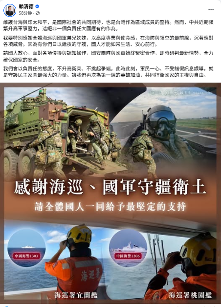 12月30日,台湾总统赖清德发文感谢海巡、国军守疆卫土。