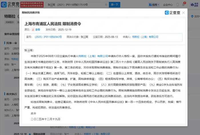 12月30日,据企业信息查询平台显示,特斯拉(上海)有限公司与张某周之间的名誉权纠纷案件近日迎来最新进展。法院已对张某周下达限制消费令,申请方为特斯拉(上海)有限公司。这一举措标志着这场持续四年的法律纠纷正式进入强制执行阶段。