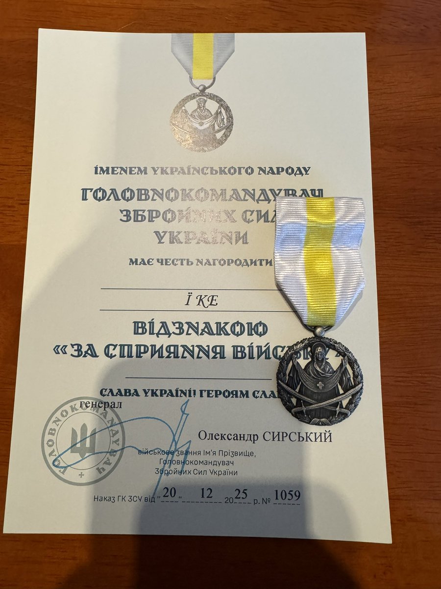 乌克兰武装部队总司令嘉奖 ——“因对军队的贡献” 近日,我荣获由**乌克兰武装部队总司令**授予的官方嘉奖—— “За сприяння війську”(因对军队的贡献)。