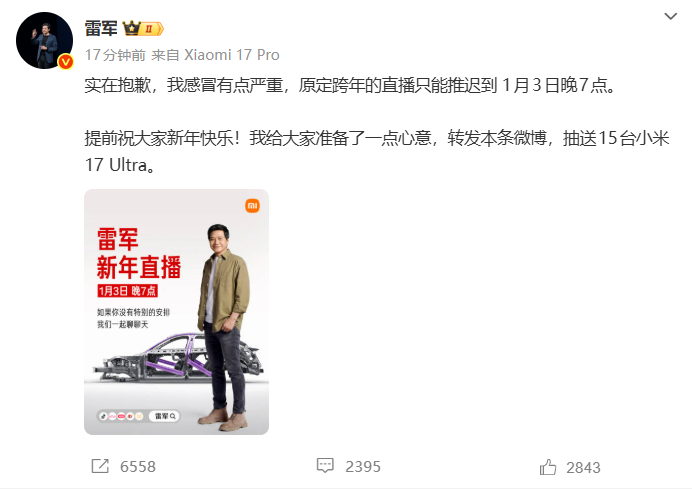 12月31日,小米集团董事长雷军发文称,感冒有点严重,原定跨年的直播推迟到1月3日晚7点。
