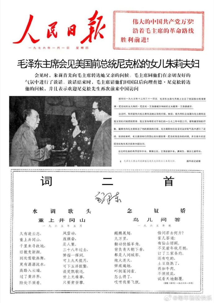 1976年1月1日人民日报第一版 “念奴娇·鸟儿问答 ,,,土豆烧熟了,再加牛肉。不须放屁!,,,”