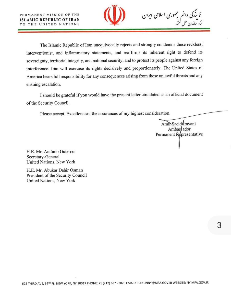 伊朗致函联合国和联合国安理会,谴责川普支持上街的伊朗老百姓的言论,并警告称,如果美国行动,伊朗将进行自卫反击。