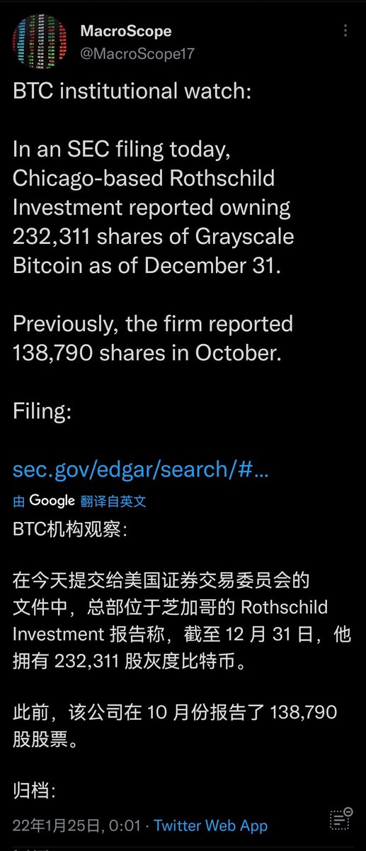 罗斯柴尔德投资公司购买了93,521股的 $GBTC ,折合现货不到70颗 $BTC 总持仓不到200颗
