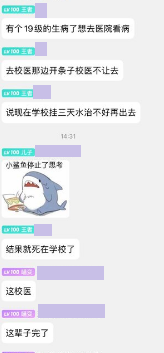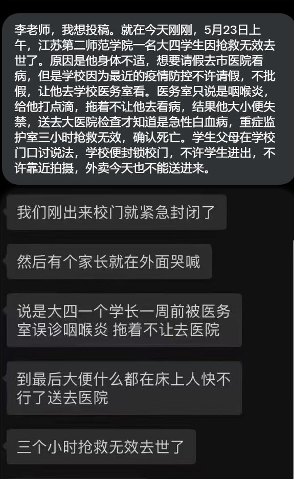 网友投稿近日,江苏第二师范大学被爆出一名大四学生身体不适想要请假去医院,被学校以“疫情防控不准请假”为由驳回,要求学生在校医院挂水三天,不好再去医院。结果学生是突发急性白血病,最终因拖延了时间导致不治身亡。