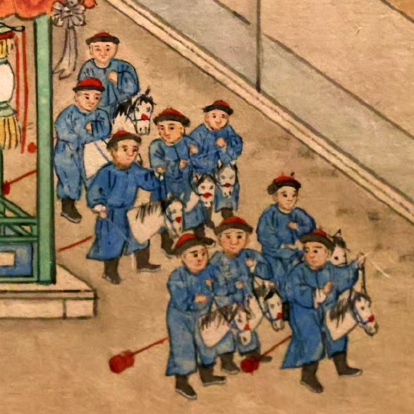 p4比较有意思,乍一看以为是侍卫之类的,结果是一群骑竹马的小孩子。竹马在明代画作里也经常看到