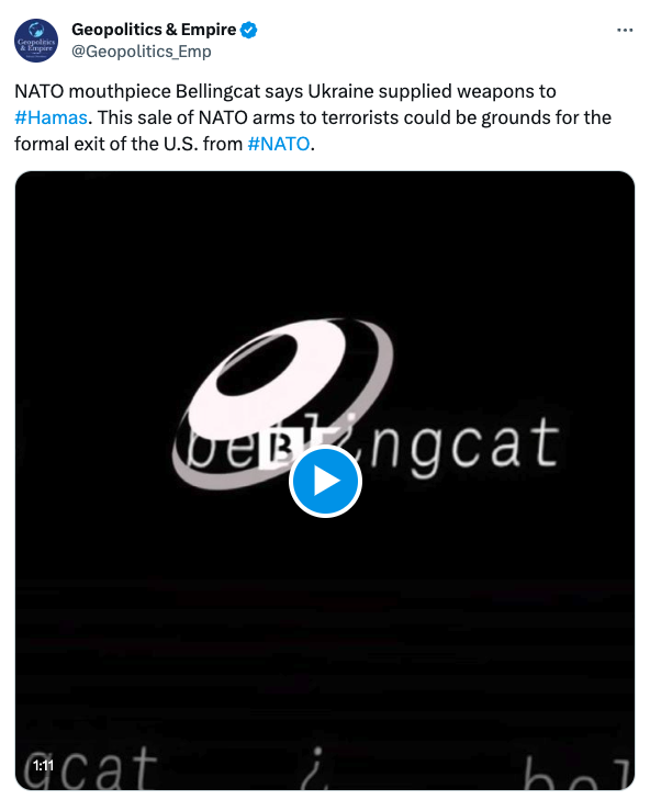 We're aware of a fake BBC video circulating on social media falsely claiming that Bellingcat has verified Ukrainian weapons sales to Hamas. We've reached no such conclusions or made any such claims. We'd like to stress that this is a fabrication and should be treated accordingly.
