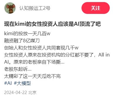国产AI行业今天最大的话题,月之暗面创始人杨植麟套现几千万的选题,最开始是从小红书爆出来的,集美们现在是什么事儿都能往小红书发,就很离谱。