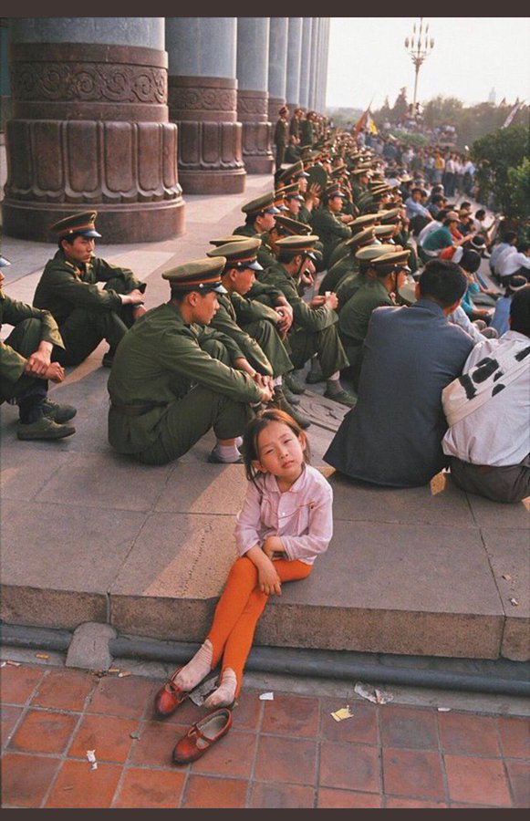 一个穿红鞋的女孩1989年5月,天安门广场,士兵与学生 摄影:Ken JareckeChinese troops observing the Tiananmen Square demonstration in May 1989 before the army was ordered to attack.