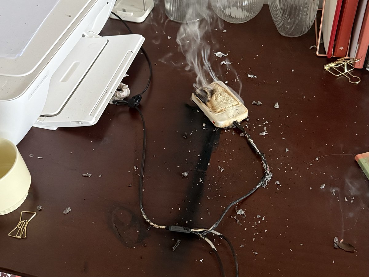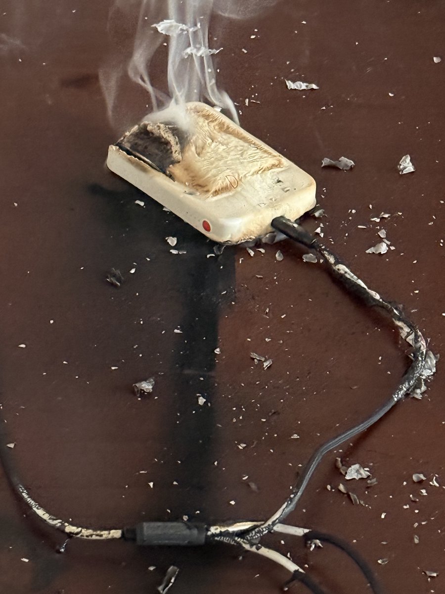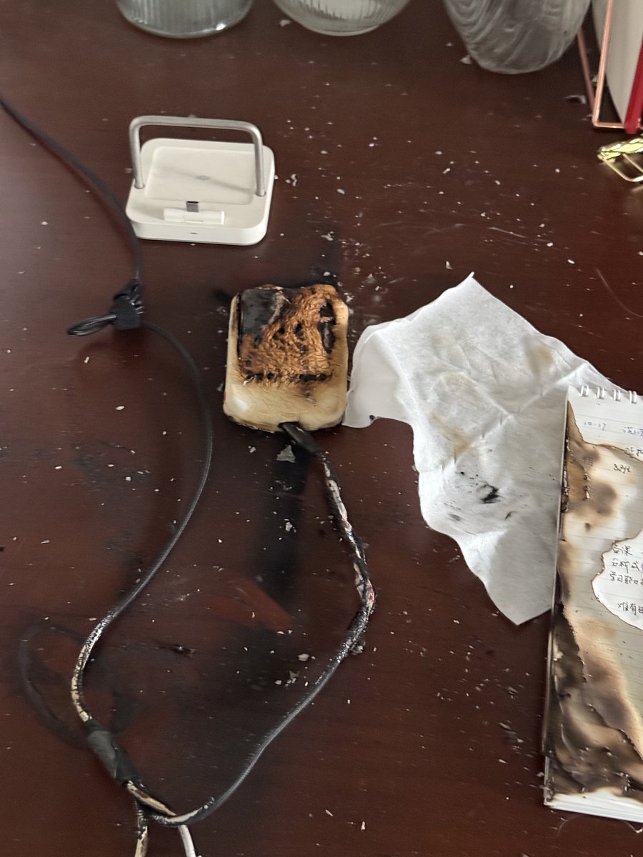 卧槽,今天下午差点家没了!22年送老婆的充电宝燃起来了!🔥又是「制糖工厂」,上次在推上看到炸了,抱有侥幸心理就没管,结果今天也遇到了啊,妈的。幸好我还在家,本来计划 5 点出门,还是我拖延了一下才看到了。一回头满屋子火光,旁边的本子和实木书桌都被烧了。再买这种颜狗产品 我就是狗!