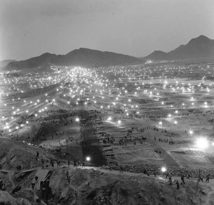 1958年7月9日,大跃进期间,怀柔水库工地夜景。(新华社记者 李子青摄)