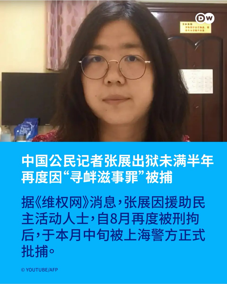 自8月张展再度被捕后,国际人权组织及记者组织也持续呼吁中方将其释放。此前有消息称,张展在出狱后被中国官方列为重点维稳对象,多次被警告若再触碰“红线”将会再度被关押。
