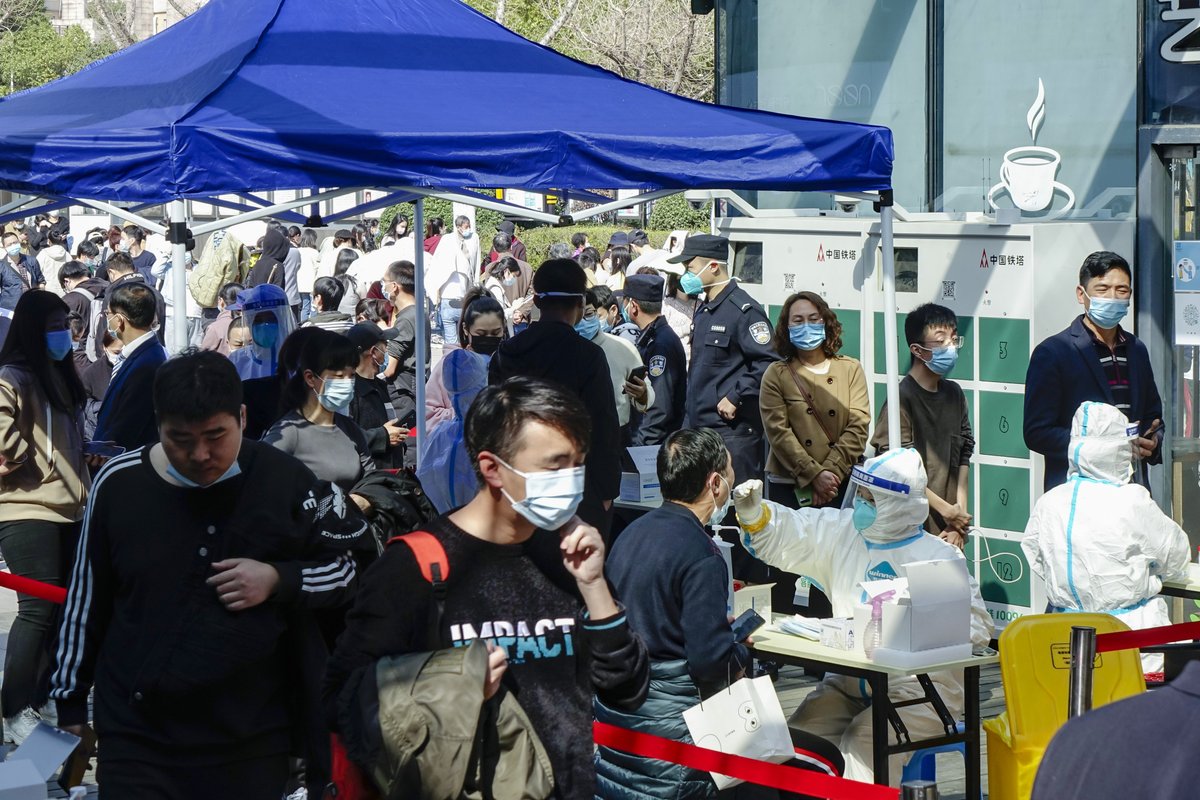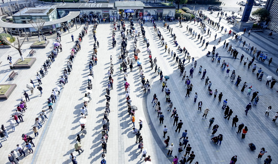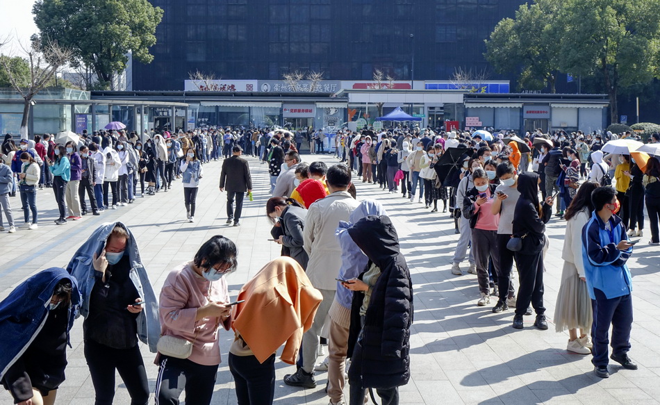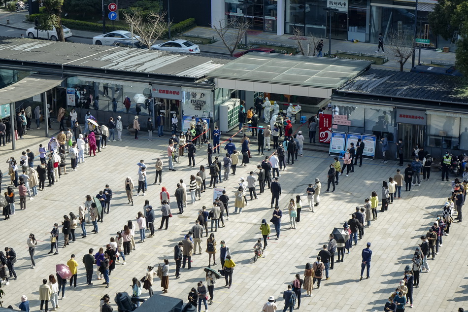 2022年3月11日,杭州城西某核酸检测点排起长队,市民有序间隔排队进行核酸检测。---澎湃视觉