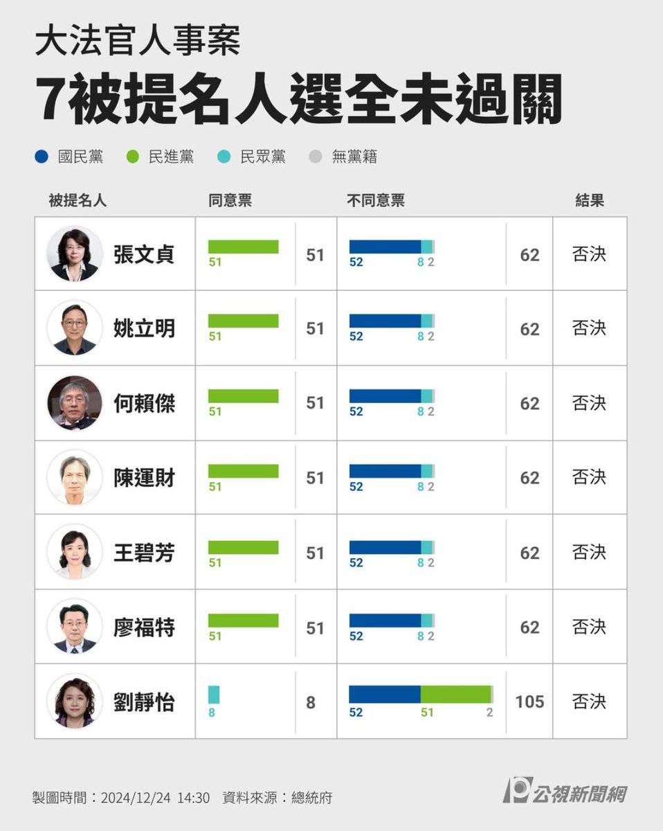 Taiwan's oppositions legislature rejected all 7 Constitutional Court nominees picked by Pres.A constitutional crisis is coming, as Lai is set to block legislations by not enacting them - an unconstitutional act but will get a pass from current DPP-packed court.
