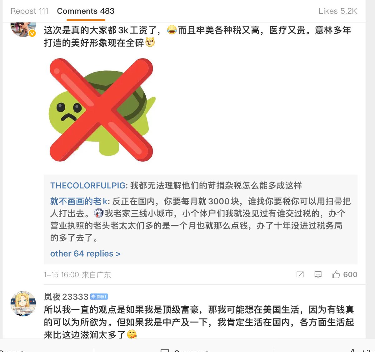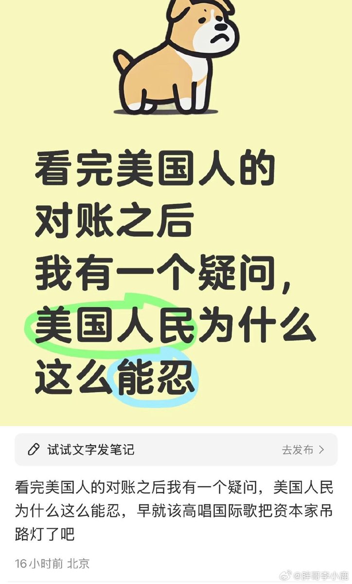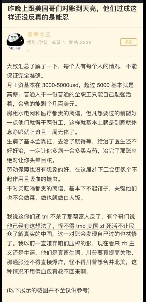 微博推送了一堆这种。就是美国的水深火热比墙国官媒说的更惨,一想到自己月入三千比美国月入五千美金的还过得好,自豪感油然而生,进而可怜美国人惨成这样都不造反奴性深重