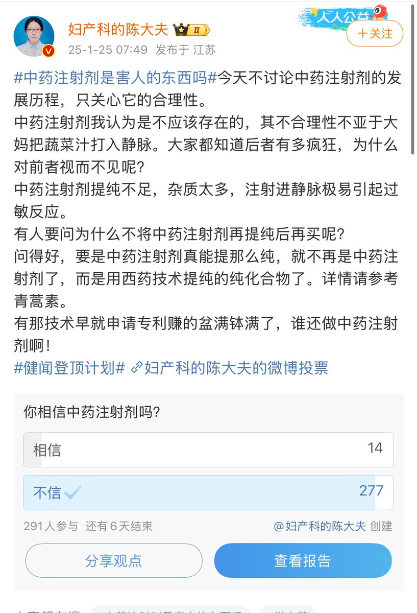 两名医生评价中药注射液和针刺麻醉; 医学博主庄时利何:针刺麻醉有一定的镇痛作用,但镇痛和麻醉相差了十万八千里 “认为镇痛就能麻醉的,以后做手术自己吃两片布洛芬得了” 无锡妇幼保健院医师陈达书:中药注射液相当于大妈把蔬菜汁打入静脉,由于中药注射剂杂质多,注射后极易引起过敏反应。