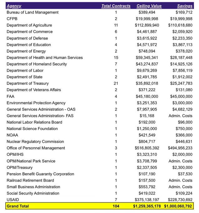 下表是政府效率部刚发布有关多元化、公平与包容(DEI)相关合同取消的最新数据及详细信息: