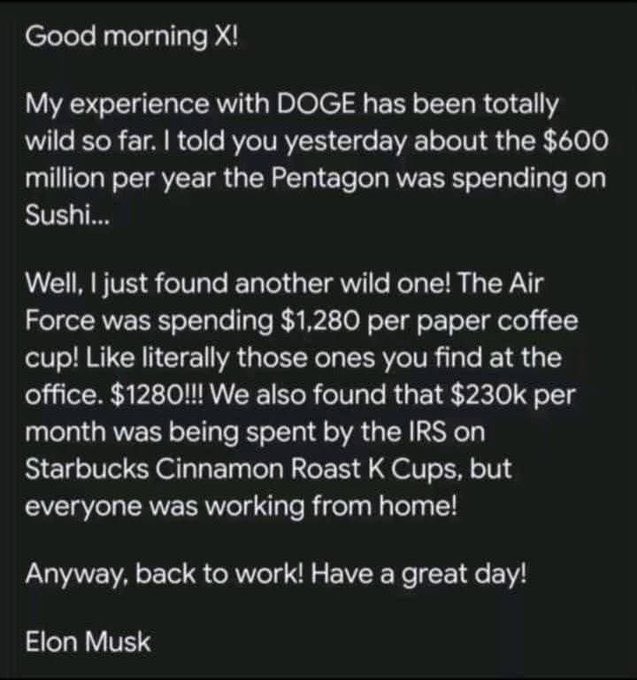 早上好,X!到目前为止,我与DOGE的经历简直太疯狂了。我昨天跟你提过五角大楼每年花费6亿美元购买寿司的事……