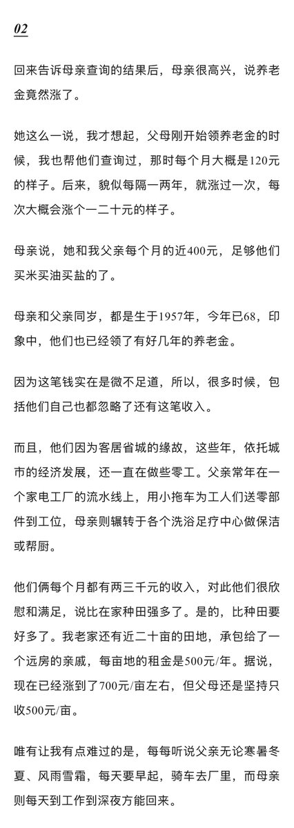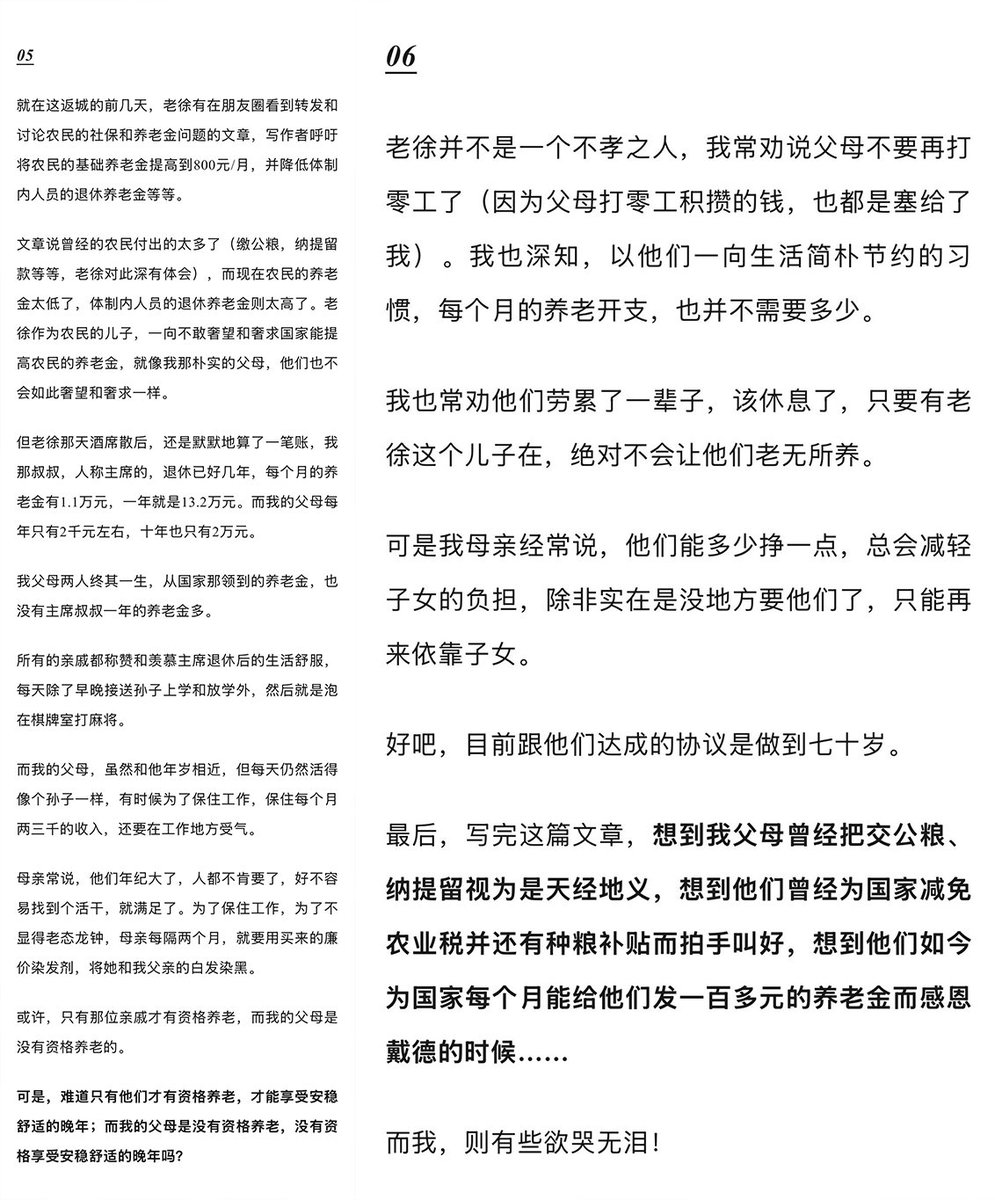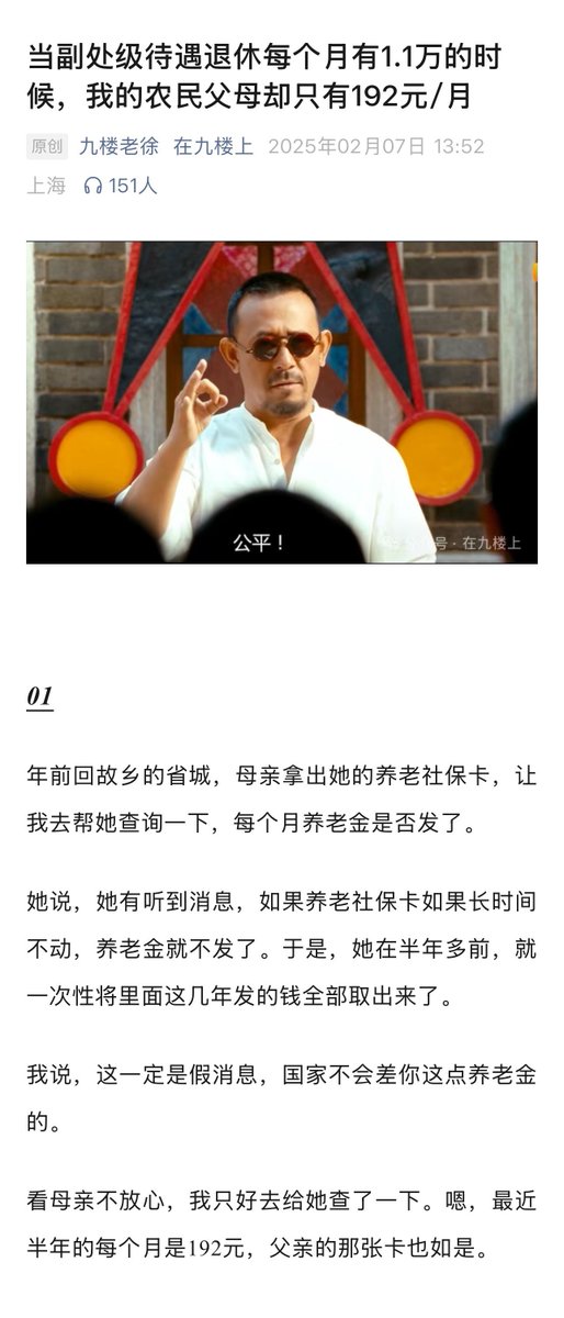 媒体人老徐:我有一个体制内退休人称主席的叔叔,每月养老金1.1万元,一年13.2万元,而我父母的养老金十年也只有2万元,父母终其一生,领取的养老金,还没叔叔一年的养老金多。 难道只有他们才有资格养老,才能享受安稳的晚年;而我的父母就没资格养老和享受安稳舒适的晚年吗?