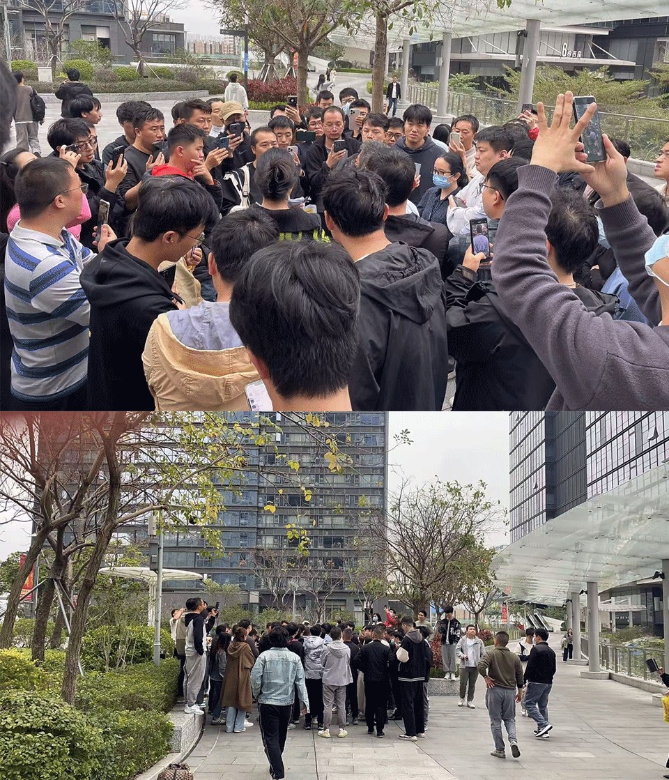 2月17日,广东深圳。网曝中软国际深圳分公司降薪,上百名员工聚集在天安云谷办公楼下维权,抗议公司降薪打压员工。 网传聊天截图称:“今天直接降薪10%到35%” “中软不协商就降工资,还有人工资是负数的”