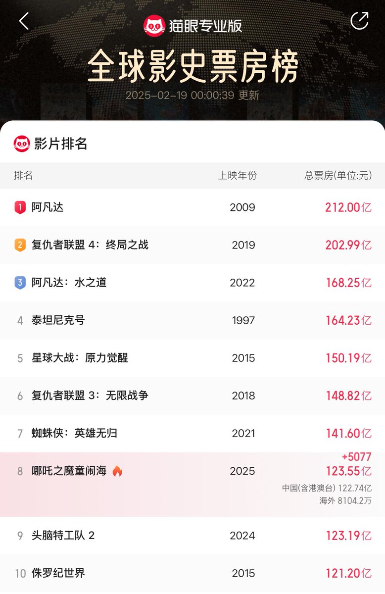 截至目前发文:《哪吒2》登顶全球动画电影票房榜、登顶中国电影票房总榜、全球影史票房榜第8名。
