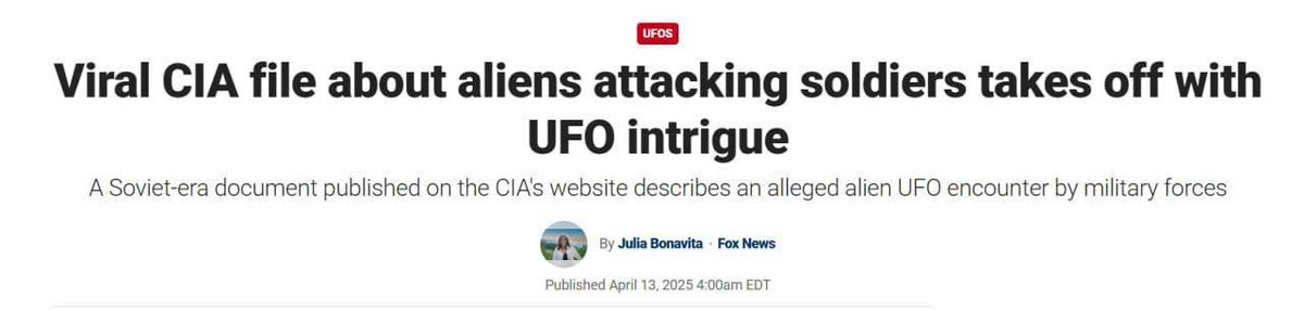 美國中央情報局網站公佈的解密文件稱,蘇聯士兵在遭遇外星UFO後死亡據稱,蘇聯士兵擊落了一架飛越軍事基地的不明飛行物,人形外星人從殘骸中出現,合併成一個物體,併發出明亮的光芒,將23名蘇聯士兵全部變成了石頭,僅兩人幸存。加拿大《週刊世界新聞》報道,該事件發生在1989年至1990年。