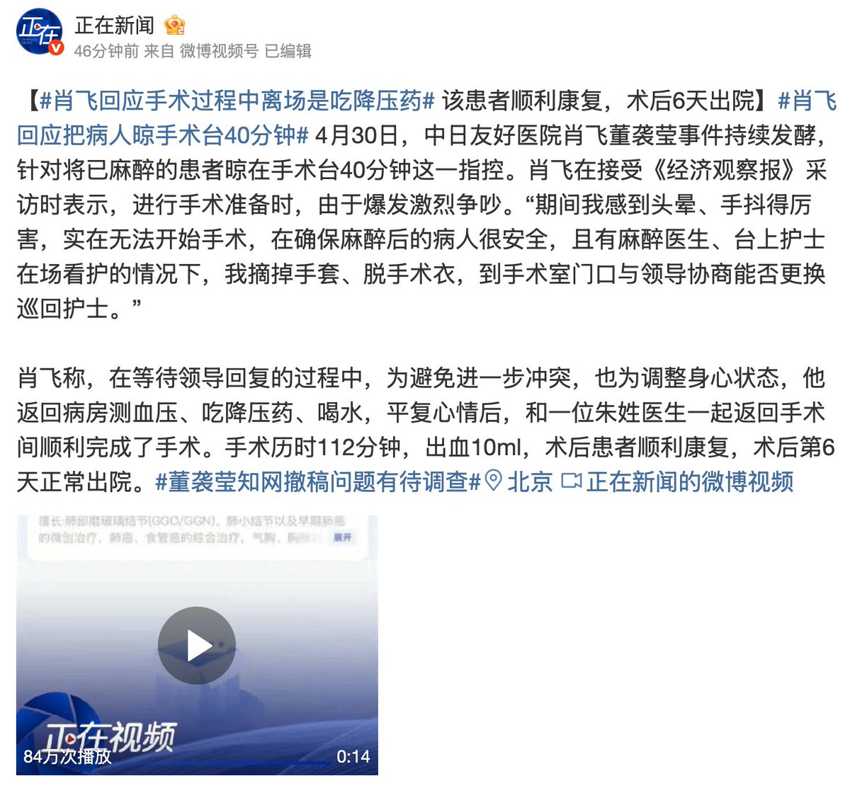 4月30日 中日友好医院被妻子举报出轨并和出轨对象丢下麻醉中的病人四十分钟的医生肖飞公开回应,称其手术中途离场是为了吃降压药。肖飞表示,进行手术准备时,由于爆发激烈争吵。“期间我感到头晕、手抖得厉害,实在无法开始手术。”
