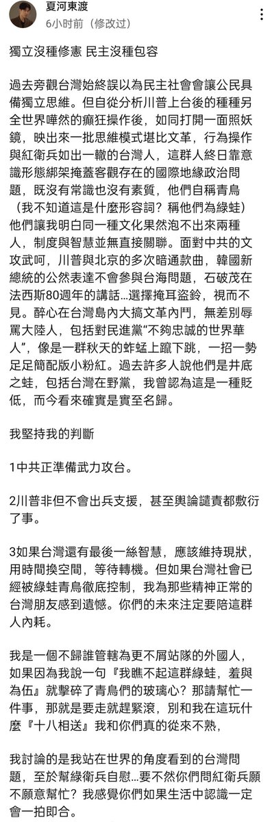 长期靠取悦台湾绿粉走起来的时政反共YouTuber【夏河东渡】、【陳老师来了】,因在节目中说了一些青鸟不爱听的话遭到绿粉围攻,受不了通通反水开始痛骂绿粉,钱不好赚啊,靠迎合终究会反目。😹😹😹😹