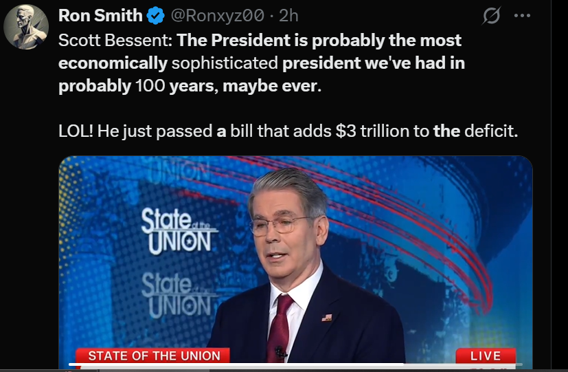 斯科特·贝森特:特朗普总统可能是我们一百年来,甚至可能是有史以来,最精通经济的总统。p:白宫里养了一群马屁精,中南海都不敢如此肉麻吹捧。