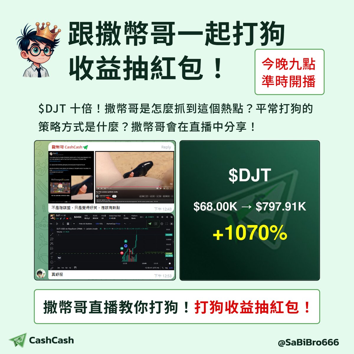 好奇 平常都怎麼抓熱點嗎?撒幣哥又抓到十倍的 $DJT!如果你想知道到底要怎麼打狗撒幣哥會在直播中跟觀眾分享他是如何打狗在直播中還會將打狗收益拿去抽紅包!看直播一邊學一邊賺!今天晚上九點準時開播,記得來看!