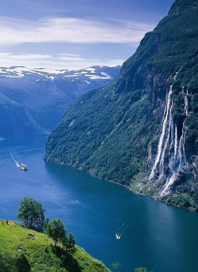 The Seven Sisters waterfall flows down to the the Geirangerfjord in Norway.