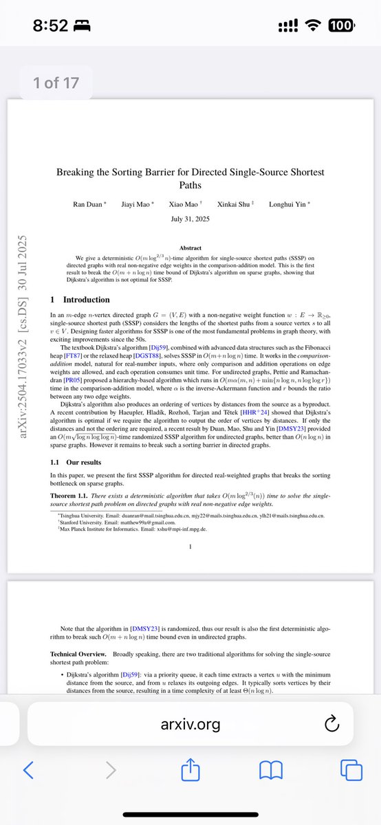 清华大学的老师和学生们找到了比 Dijkstra 算法更快的最短路搜索算法。看了一眼是 non-negative 权重,我想用不了多久就可以刷新 Bellman-Ford 算法了。图论一直是算法领域我最喜欢的部分,世界大多数场景都是一张无向图。可能是最近唯一会看的纯算法论文了。人类还有希望(打败 vibe coding