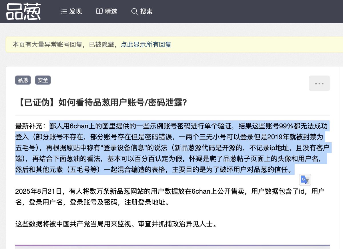 后续,原楼主 对部分示例账号进行验证,发现 99% 的账号无法登录,其余可登录的账号多为早期已被封禁的账户,怀疑这是通过公开信息拼凑生成的虚假数据,用于破坏用户对品葱的信任。