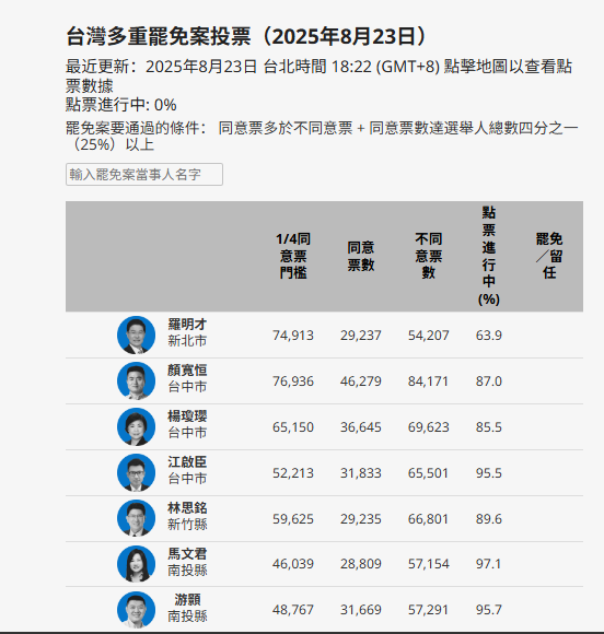 台湾8月23日大罢免最新数据