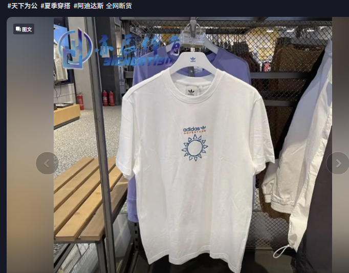近日,阿迪达斯太阳印花T恤卖断货,网友将其理解为中国民国旗帜图案,并配文“天下为公”。