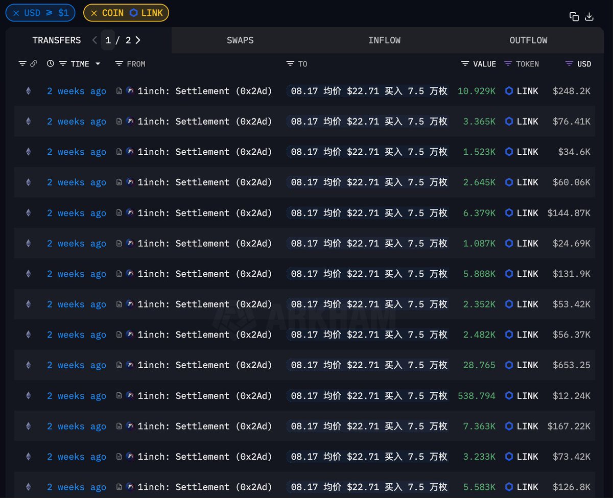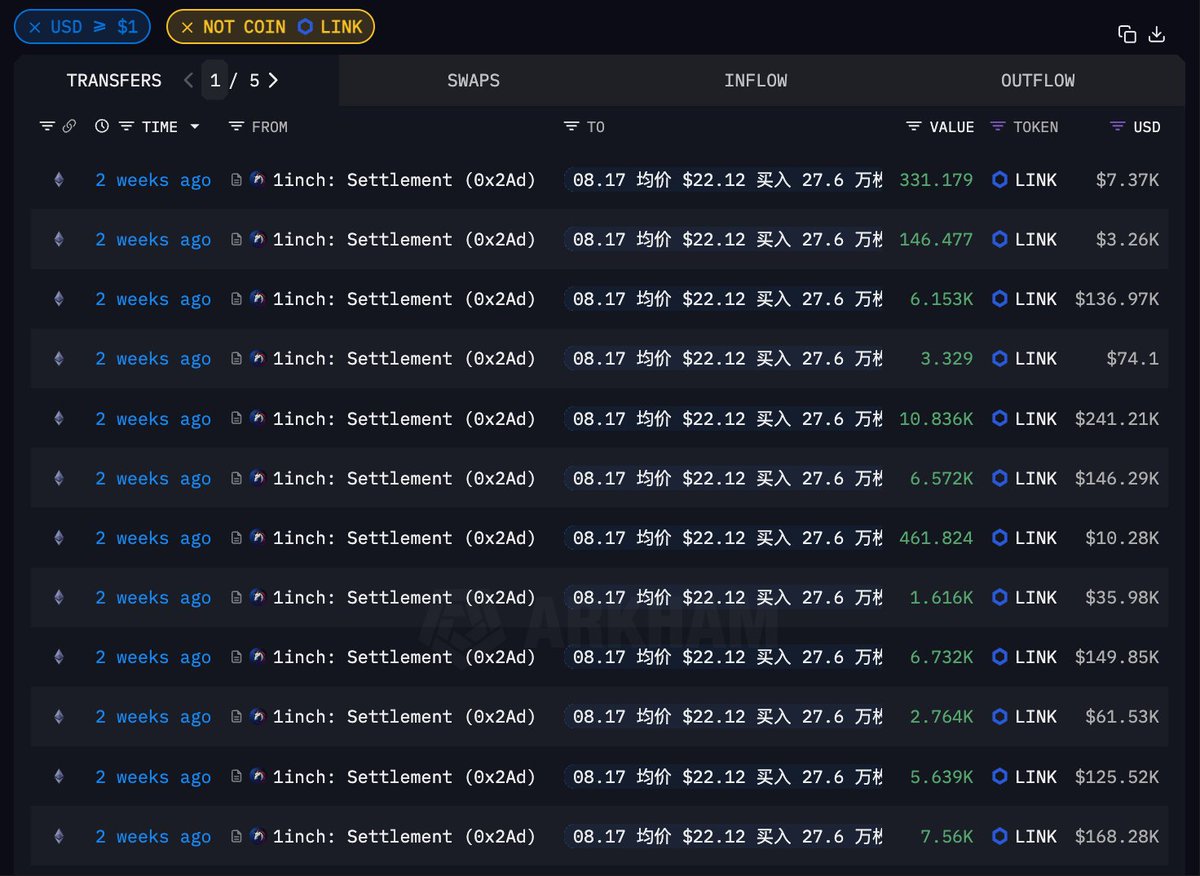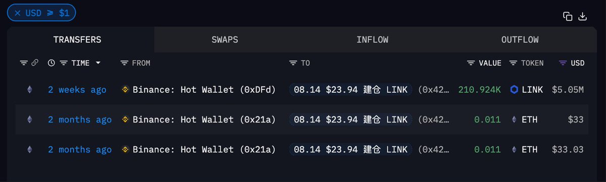 之前囤 $LINK 的地址都麻了,原来是这么个事儿?🥹1️⃣ 地址 0x42B...6bbf6:08.17 以均价 $23.94 建仓 21 万枚(506 万美元),目前浮盈 30.3 万美元2️⃣ 地址 0xCEd...837b9:08.17 均价 $22.12 在链上买入 27.6 万枚 LINK(663 万美元),目前浮盈 90 万美元3️⃣ 地址 0x61b...00EC3:08.17 均价