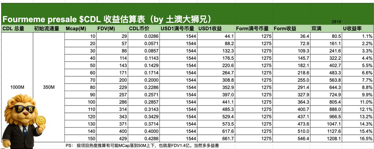 按照7500万个币给1.94亿个USD1计算,每投入1个USD1你可以获得0.386个 $CDL ,而投入Form则可以获得1.27个 $CDL 。