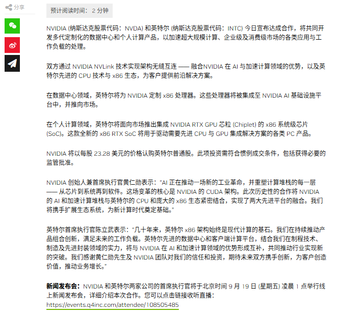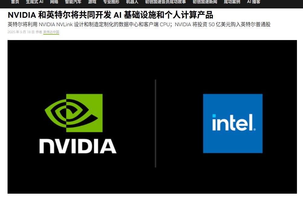 9月18日,算力芯片巨头英伟达宣布向英特尔普通股投资50亿美元,另外,双方将合作开发多代定制数据中心和PC产品,以加速超大规模、企业和消费者市场的应用程序和工作负载。英伟达首席执行官黄仁勋表示:“此次历史性合作将英伟达的AI和加速计算堆栈与英特尔的CPU和庞大的x86生态系统紧密结合,实现了两大世界级平台的融合。我们将携手拓展生态系统,为下一个计算时代奠定基础。”