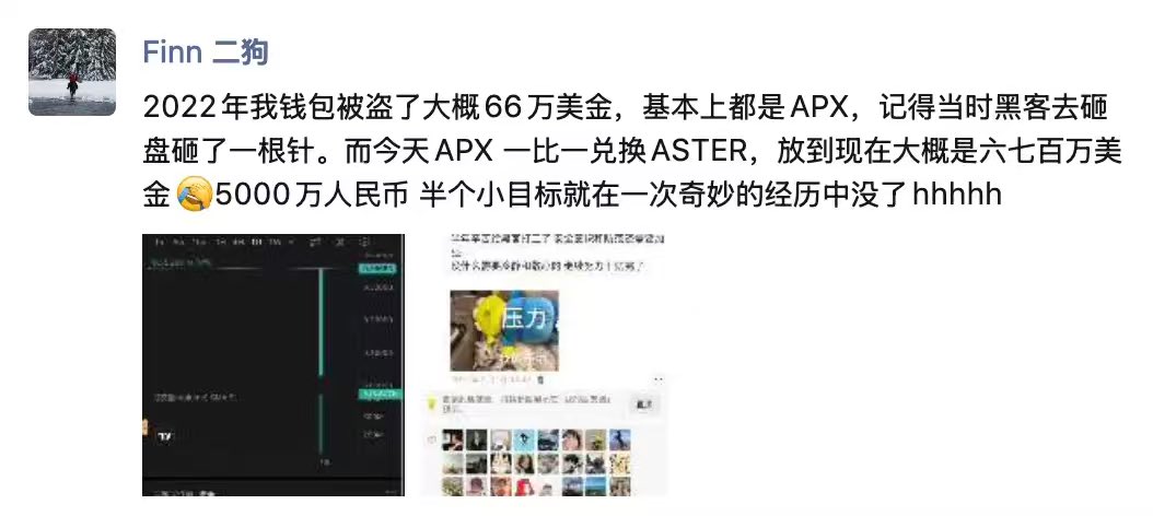 看到狗哥朋友圈说三年前被盗了 66 万美金的 APX,现在应该价值六七百万了,好奇找了下当时的交易记录,发现地址 0xd7F…3317B 似乎就是他的(@CryptoErgou 悄悄艾特求证下):昨天之前还持有 805.7 万枚 APX,排名个人持有者 TOP3,过去 24 小时已经把 605.7 万枚充值进 Aster 去换币了