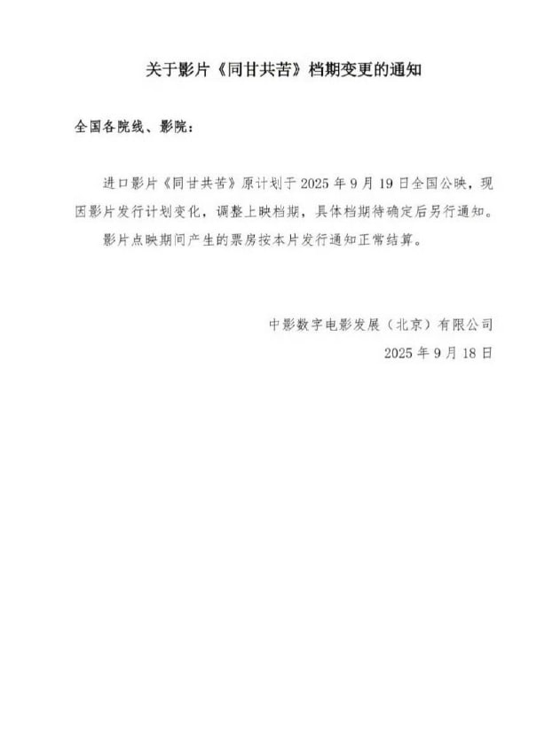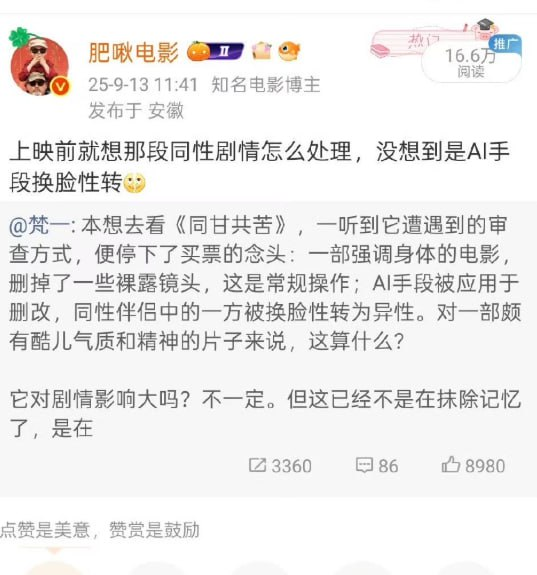 9月18日,影片《同甘共苦》发布档期变更的通知,此前该影片被曝剧中同性伴侣亲密镜头中的一方被使用AI软件换脸性转为异性引发网友集体吐槽。