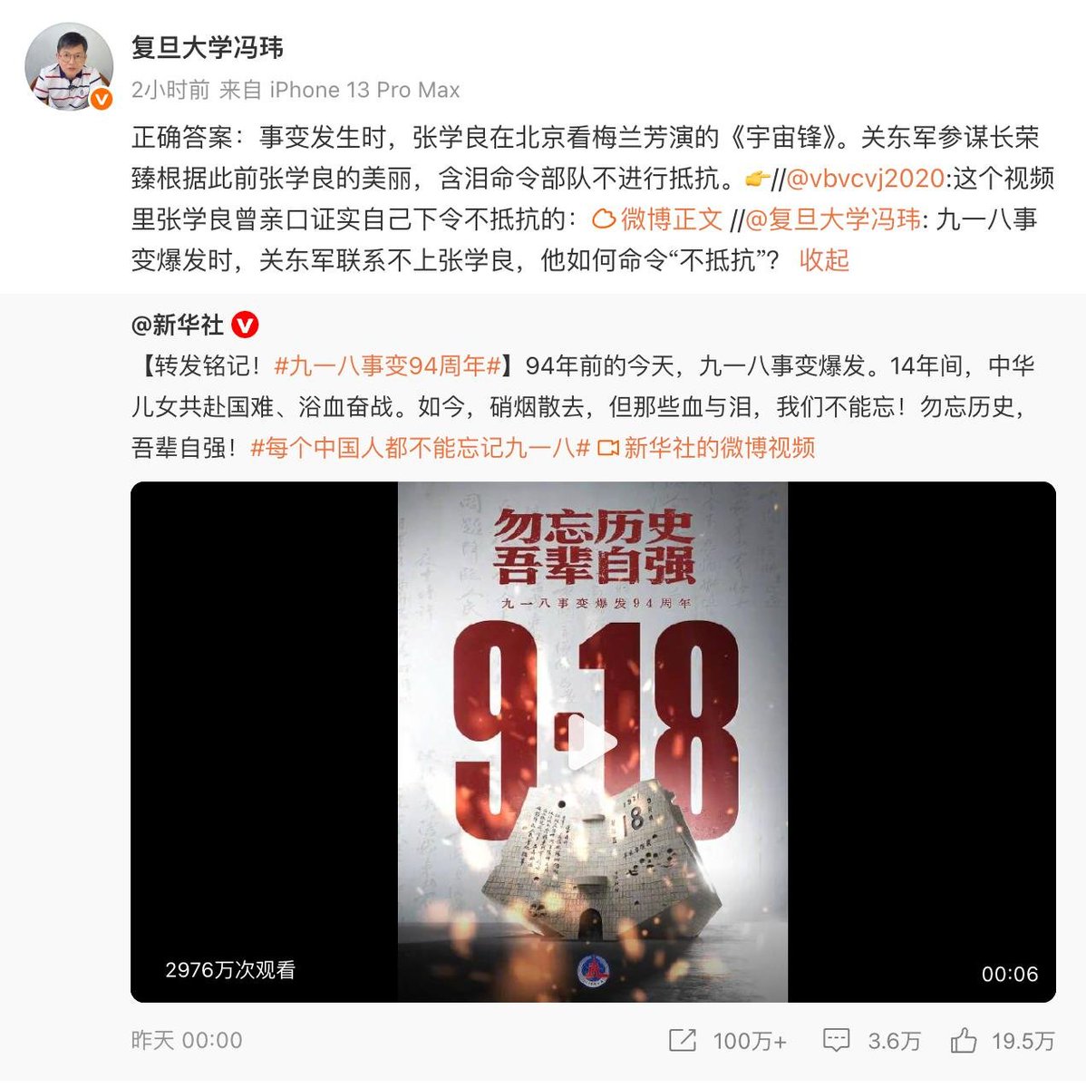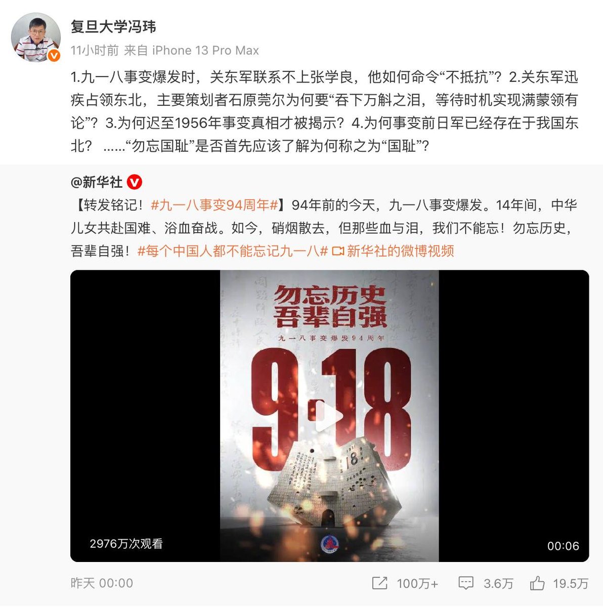 9月19日,复旦大学冯玮教授公开炮轰新华社,抛出九一八事变四大谜团:1.九一八事变爆发时,关东军爆发时联系不上张学良,他如何下达“不抵抗”令?2.石原莞尔速占东北,为何却“吞万斛之泪、待机推行满蒙论”?3.真相为何拖至1956年方揭?4.为何事变前日军已经存在于我国东北?……“勿忘国耻”是否首先应该