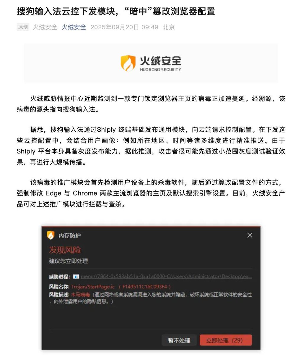 9月20日,火绒安全称近期监测到一款专门锁定浏览器主页的病毒正加速蔓延。经溯源,该病毒的源头指向搜狗输入法。该病毒的推广模块会首先检测用户设备上的杀毒软件,随后通过篡改配置文件的方式,强制修改 Edge 与 Chrome 两款主流浏览器的主页及默认搜索引擎设置。