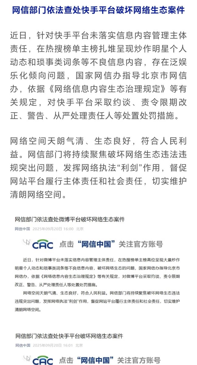 9月20日,据网信中国消息,国家网信办近期对微博、快手平台作出处罚。两平台因未落实信息内容管理主体责任,在热搜榜长期充斥炒作明星动态、琐事等不良信息,造成泛娱乐化倾向。 网信办已对微博、快手进行约谈,责令限期整改,予以警告,并从严追究相关责任人。网信部门表示,将持续整治破坏网络生态的突出问题,督促平台履行主体责任,维护清朗网络空间。